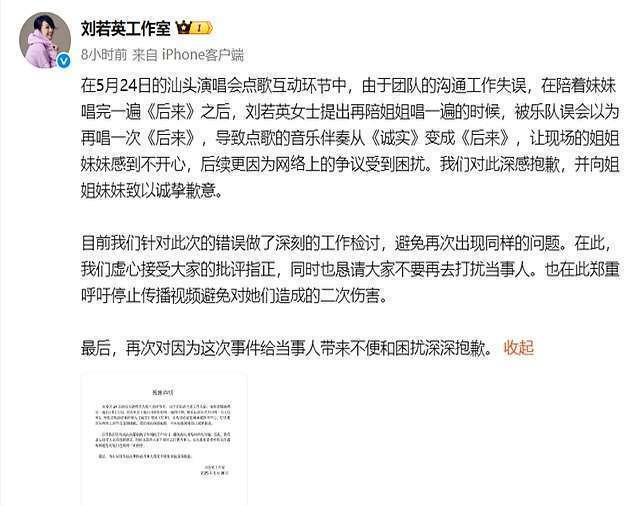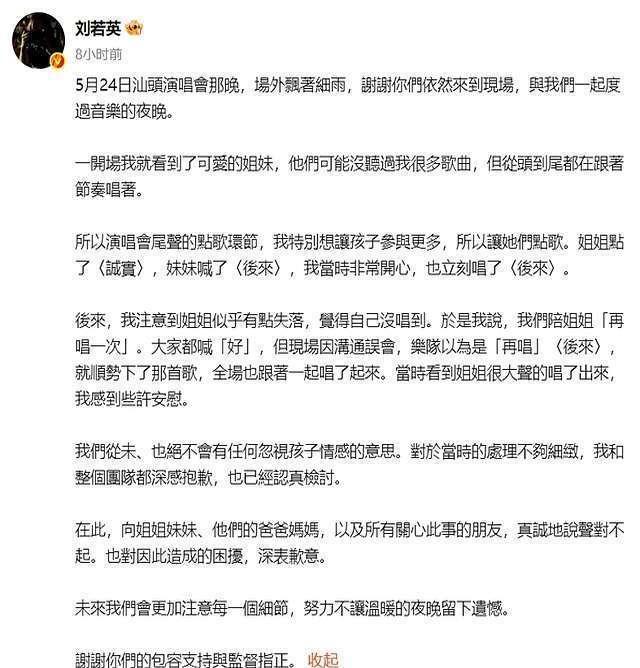 咱也不行矢口不移东谈主家刘若英即是有利的。东谈主家也谈歉了,也施展了。也许,真的是疏导出了问题,也许,真的是个不测。谁也不想把演唱会搞砸,更何况,如故让一个小女孩伤心落泪。